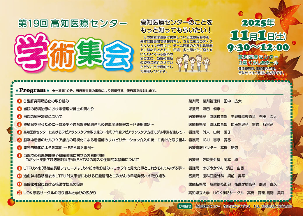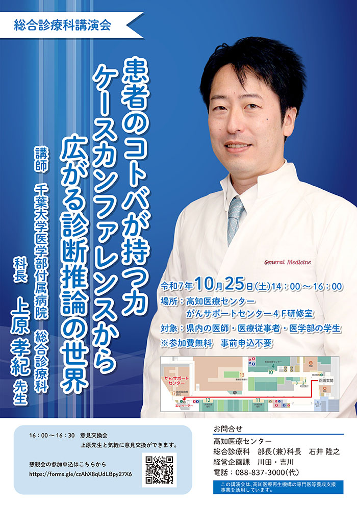 HOME講演会・研修会 講演会・研修会 当院で開催、また当院の職員が講師等で参加する講演会・研修会です。皆さまのご参加をお待ちしています。 看護師他施設公開研修はこちら 講演会・研修会一覧 名称 第19回 高知医療センター 学術集会 開催日 令和7年11月1日(土) 開催時間 9:30~12:00 開催場所 高知医療センター 2階 くろしおホール 名称 総合診療科講演会 『患者のコトバが持つ力~ケースカンファレンスから広がる診断推論の世界~』 開催日 令和7年10月25日(土) 開催時間 14:00~16:00 開催場所 高知医療センター内 がんサポートセンター4F研修室 備考 県内の医師、医療従事者、医学部の学生向け 1 / 11 病院紹介 病院長挨拶 理念、基本方針 病院指標 倫理指針 個人情報保護方針等 患者さんの権利章典と患者さんの責務 高知医療センターの概要 沿革 組織体制 ホームページに掲載が必要な施設基準等及び掲示事項 施設案内 包括同意について 看護師による特定行為の包括同意についてのお願い 薬剤局 院内製剤の使用について アクセス 企業団議会 登録医制度 講演会・研修会 医療行政・大学などの方へ 広報 病院情報公開 医療の質・安全の向上を目指して 医療サービスの向上を目指して 医療機能情報提供制度に基づく情報提供 リンク 医療費に関するお知らせ