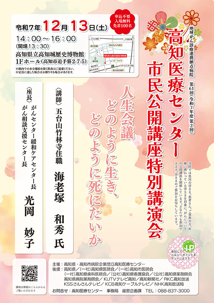 名称 第61回(令和7年度 第2回)高知医療センター 市民公開講座 特別講演会 開催日 令和7年12月13日(土) 開催時間 14:00~16:00(開場13:30) 開催場所 高知県立高知城歴史博物館 高知市追手筋2-7-5 備考 申込不要・入場無料 -