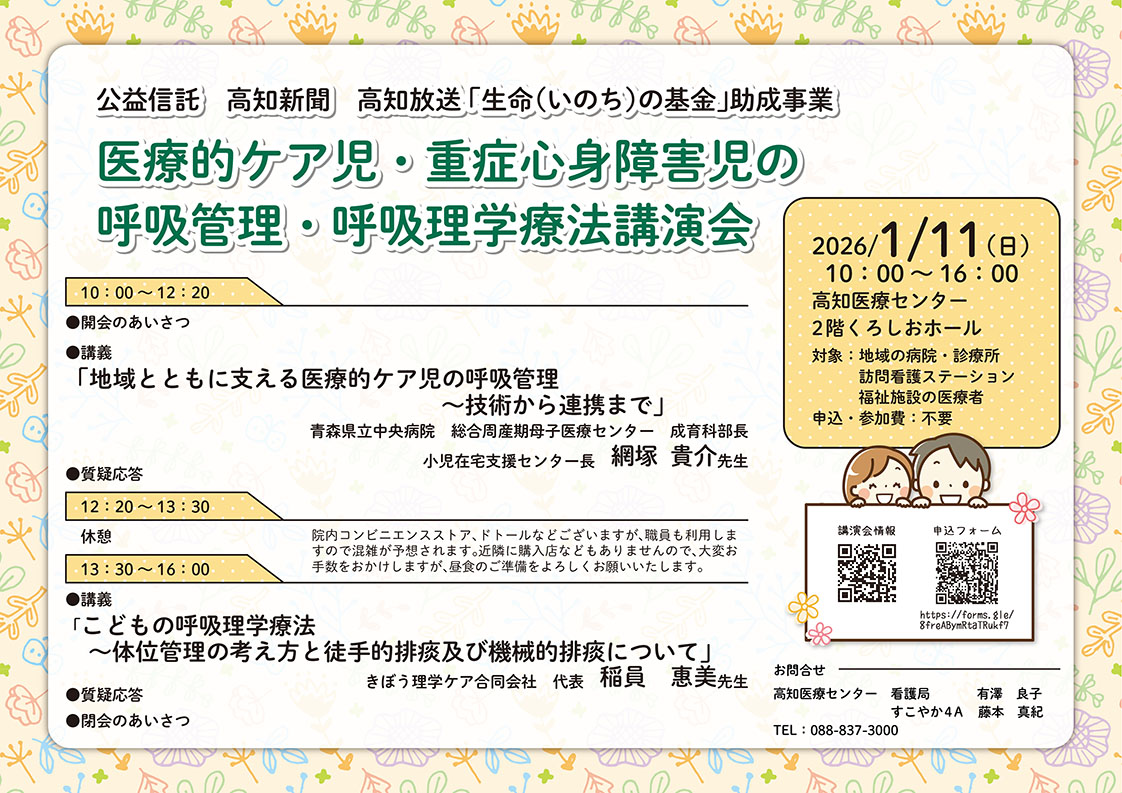 名称 医療的ケア児・重症心身障害児の呼吸管理・呼吸理学療法 開催日 令和8年1月11日(日) 開催時間 10:00~16:00 開催場所 高知医療センター 2階 くろしおホール 備考 対象:地域の病院・診療所・訪問看護ステーション・福祉施設の医療者 -