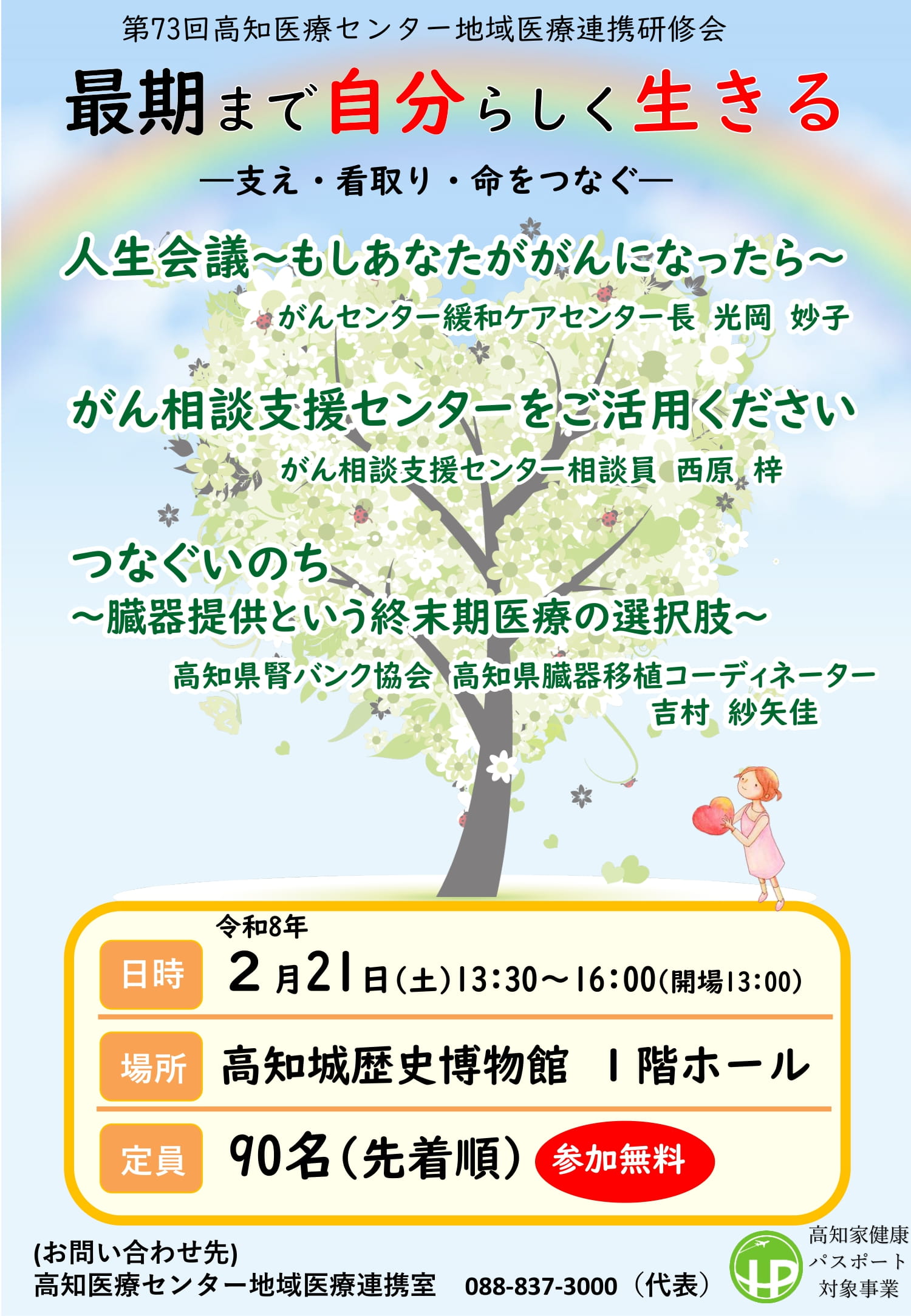名称 第73回高知医療センター地域医療連携研修会(一般の方向け) 「最期まで自分らしく生きる―支え・看取り・命をつなぐ―」 開催日 令和8年2月21日(土) 開催時間 13:30~16:00(13:00より受付開始) 開催場所 高知城歴史博物館 1階ホール