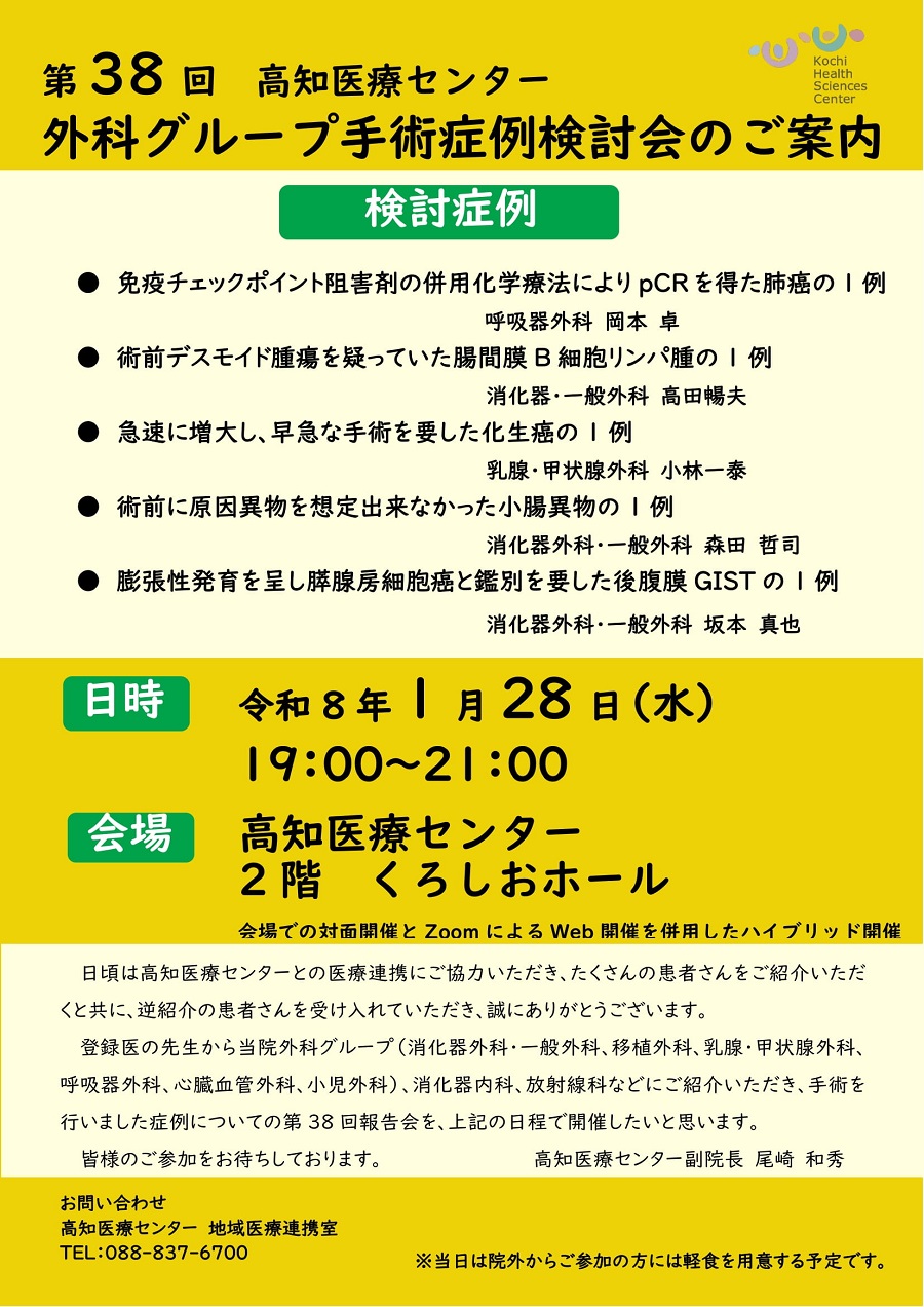 名称 第38回外科グループ手術症例検討会(医療従事者対象)(ハイブリッド開催) 開催日 令和8年1月28日(水) 開催時間 19:00〜21:00 開催場所 高知医療センター 2階 くろしおホール 備考 ハイブリッド開催 -