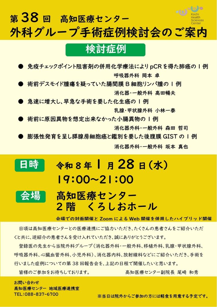 HOME講演会・研修会第38回外科グループ手術症例検討会(医療従事者対象)(ハイブリッド開催) 第38回外科グループ手術症例検討会(医療従事者対象)(ハイブリッド開催) 第38回外科グループ手術症例検討会を以下の日程で開催します。 皆様のご参加をお待ちしております。 会場及びZOOMによるハイブリッド開催です。 FAX(様式はこちら)もしくは様式内の二次元コードからお申し込みをお願いします。 FAXは088-837-6701までお願いします。 申込締切:令和8年1月22日(木) < 前の記事へ 病院紹介 病院長挨拶 理念、基本方針 病院指標 倫理指針 個人情報保護方針等 患者さんの権利章典と患者さんの責務 高知医療センターの概要 沿革 組織体制 ホームページに掲載が必要な施設基準等及び掲示事項 施設案内 包括同意について 看護師による特定行為の包括同意についてのお願い 薬剤局 院内製剤の使用について アクセス 企業団議会 登録医制度 講演会・研修会 医療行政・大学などの方へ 広報 病院情報公開 医療の質・安全の向上を目指して 医療サービスの向上を目指して 医療機能情報提供制度に基づく情報提供 リンク 医療費に関するお知らせ