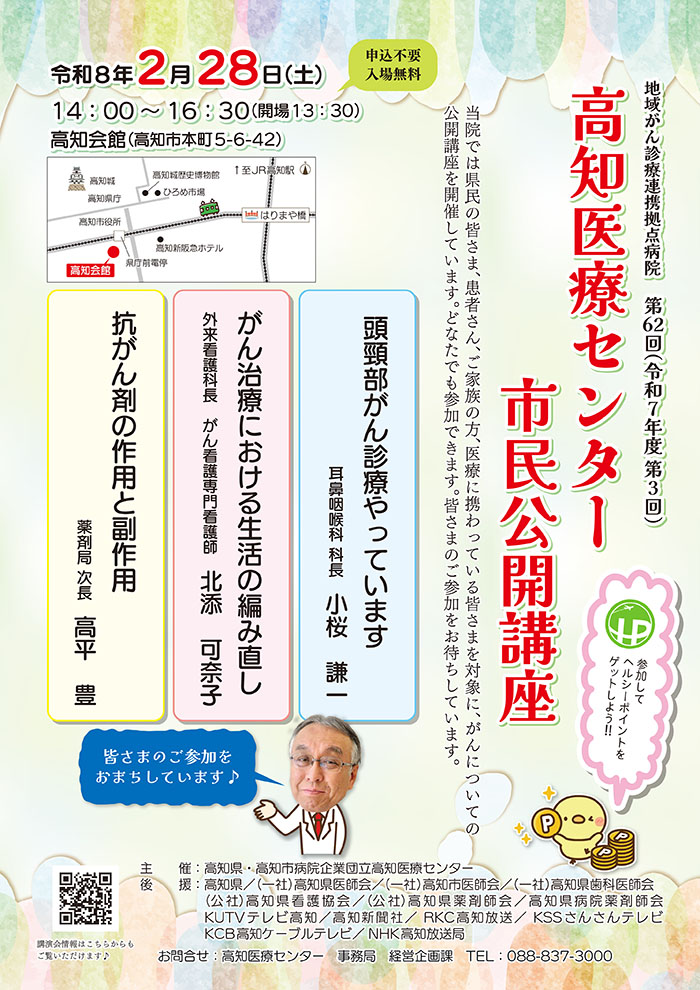 HOME講演会・研修会第62回(令和7年度 第3回)高知医療センター 市民公開講座(高知市) 第62回(令和7年度 第3回)高知医療センター 市民公開講座(高知市) 2月28日(土)高知会館にて高知医療センター 市民公開講座を開催します。 お誘いあわせのうえ、ぜひお越しください。 たくさんの方のご来場をお待ちしています! 次の記事へ > 病院紹介 病院長挨拶 理念、基本方針 病院指標 倫理指針 個人情報保護方針等 患者さんの権利章典と患者さんの責務 高知医療センターの概要 沿革 組織体制 ホームページに掲載が必要な施設基準等及び掲示事項 施設案内 包括同意について 看護師による特定行為の包括同意についてのお願い 薬剤局 院内製剤の使用について アクセス 企業団議会 登録医制度 講演会・研修会 医療行政・大学などの方へ 広報 病院情報公開 医療の質・安全の向上を目指して 医療サービスの向上を目指して 医療機能情報提供制度に基づく情報提供 リンク 医療費に関するお知らせ