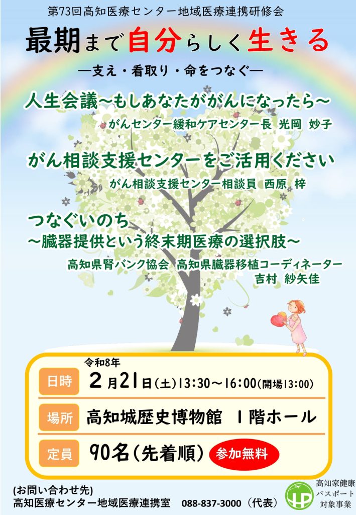 HOME講演会・研修会第73回高知医療センター地域医療連携研修会(一般の方向け) 「最期まで自分らしく生きる―支え・看取り・命をつなぐ―」 第73回高知医療センター地域医療連携研修会(一般の方向け) 「最期まで自分らしく生きる―支え・看取り・命をつなぐ―」 令和8年2月21日(土)に第73回地域医療連携研修会を開催します。 参加費無料、申込み不要で、どなたでも参加できますので、ぜひお越しください。 今回の会場は、高知城歴史博物館1階ホールとなっています。お間違えの無いようご注意ください。 < 前の記事へ 次の記事へ > 病院紹介 病院長挨拶 理念、基本方針 病院指標 倫理指針 個人情報保護方針等 患者さんの権利章典と患者さんの責務 高知医療センターの概要 沿革 組織体制 ホームページに掲載が必要な施設基準等及び掲示事項 施設案内 包括同意について 看護師による特定行為の包括同意についてのお願い 薬剤局 院内製剤の使用について アクセス 企業団議会 登録医制度 講演会・研修会 医療行政・大学などの方へ 広報 病院情報公開 医療の質・安全の向上を目指して 医療サービスの向上を目指して 医療機能情報提供制度に基づく情報提供 リンク 医療費に関するお知らせ