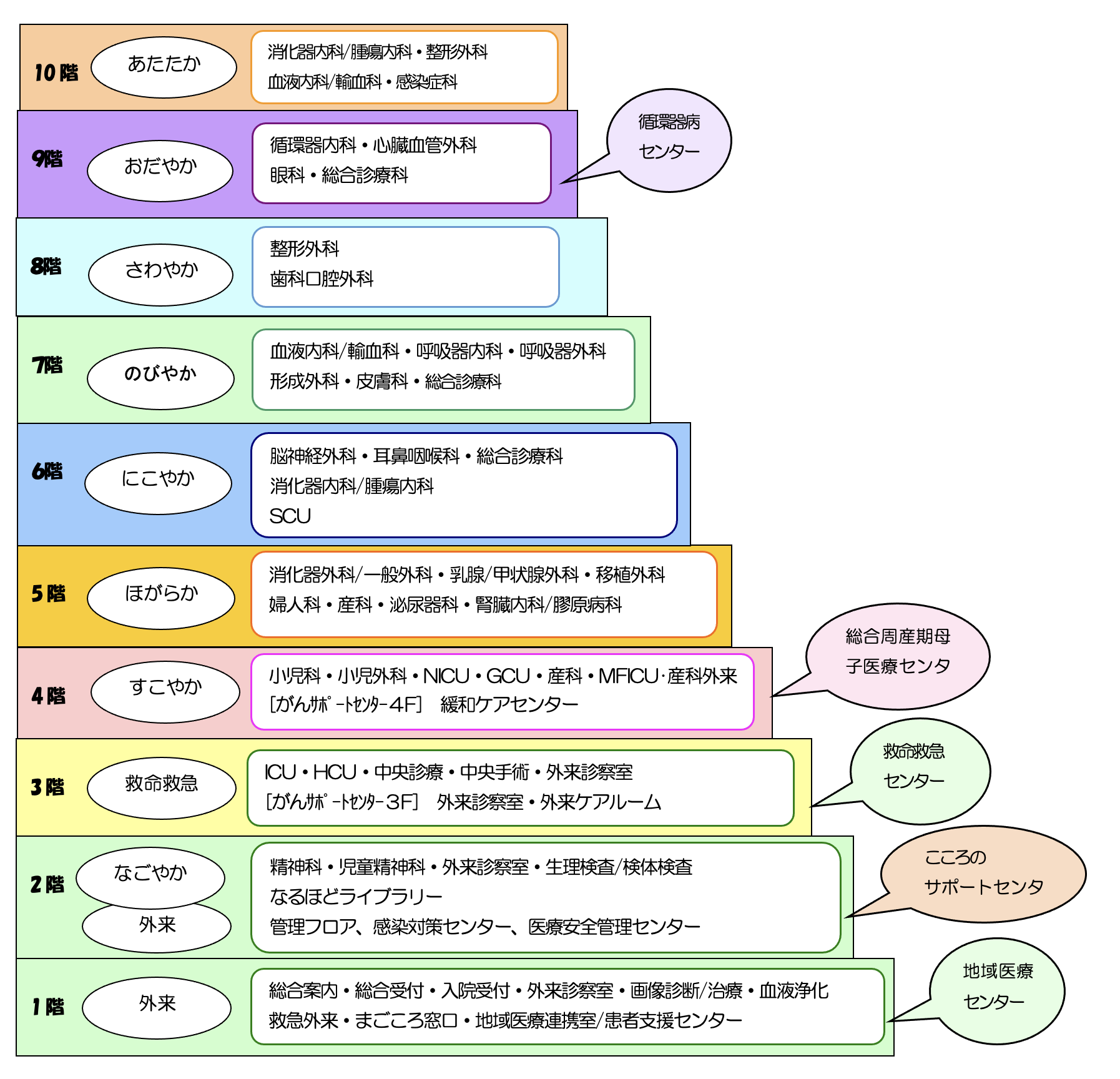 HOME診療科・部門局看護局看護の特徴フロアごとの看護の特長 フロアごとの看護の特長 フロアの環境的特長 フロアごとにユニークな名称とイメージカラー、高知の気候や特長を表現したキャラクタが決まっており、癒しの環境づくりを行っています。中央にスタッフステーション、東西南北の4箇所にスタッフコーナーがあります。 フロアごとの看護の特長 ※各階をクリックしていただくと詳細がご覧いただけます。 4階以上のフロアはA・Bの2部署から成り、入院患者の診療科構成が決まっていますが、原則的にはフリーアドレスです。 診療科・部門 診療科 局 医療局 看護局 薬剤局 医療技術局 栄養局 事務局 センター 部門