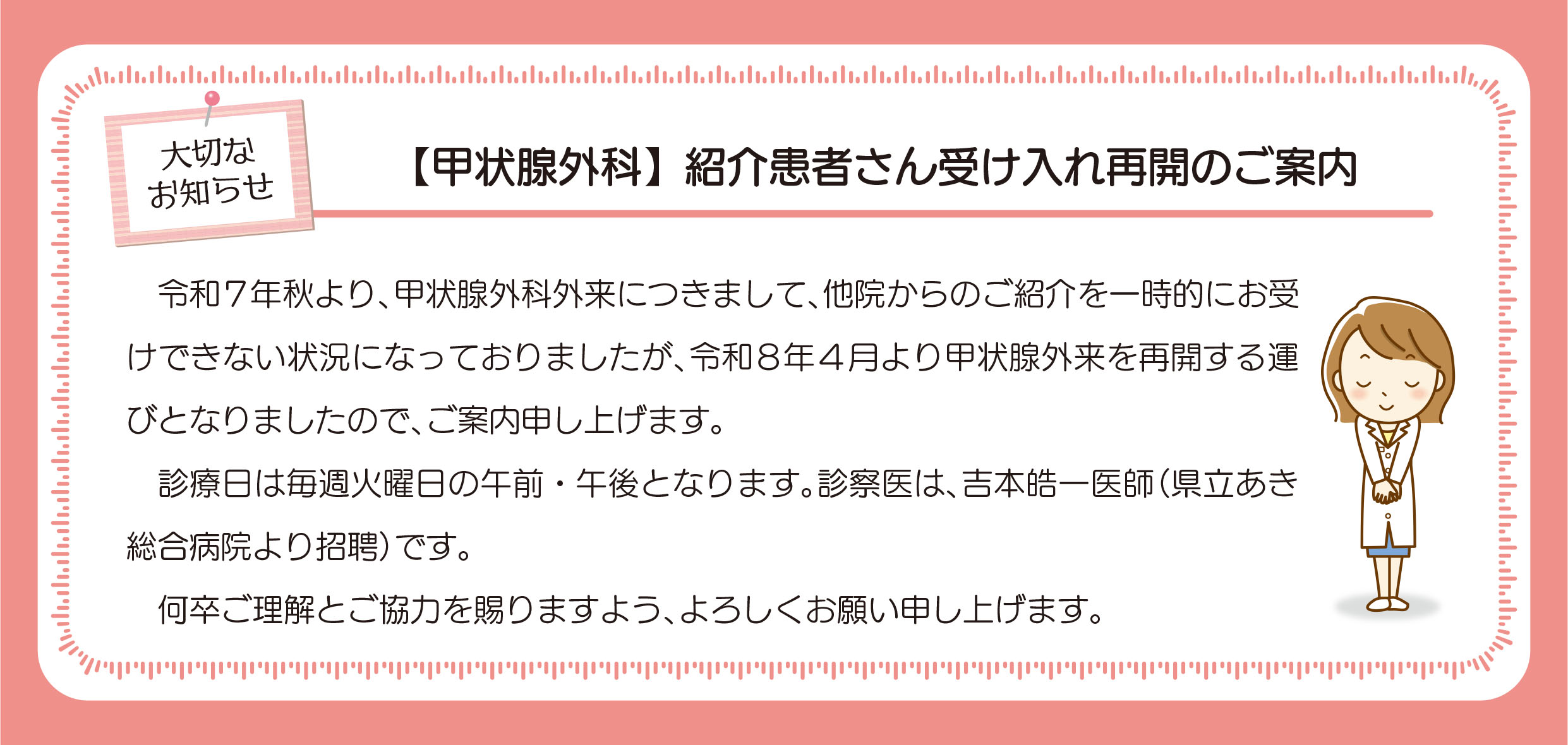 甲状腺外科手術におきまして、令和8年度は医師の体制の都合により、当院の医師による手術を他の医療機関で検討させていただいております。ご理解くださいますようにお願いいたします。